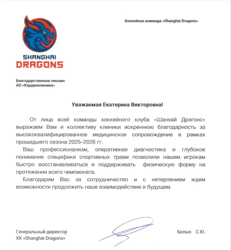 КардиоКлиника получила благодарственное письмо от команды китайского хоккейного клуба «Шанхай Дрэгонс»
